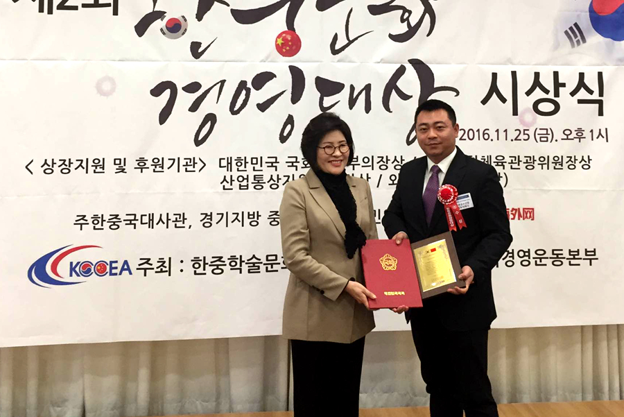 11月25日,由韓中學術文化交流協會與韓國國會、中國駐韓大使館等單位共同舉辦的2016第二屆中韓文化經營大獎頒獎儀式在首爾空軍會館隆重舉行。新華聯錦繡山莊開發株式會社受邀出席頒獎儀式,并榮獲國會副議長大獎。該獎主要表彰韓國新華聯在土地資源開發、旅游資源開發與保護及國際交流等方面所做出的突出貢獻。