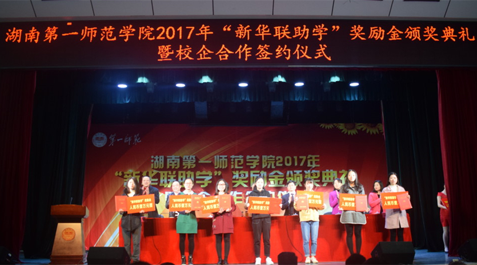 11月14日下午,湖南第一師范學院2017年“新華聯助學”獎勵金頒獎典禮暨校企合作簽約儀式在湖南一師實驗劇場隆重舉行。新華聯集團高級助理總裁、工會主席兼企業文化部總監楊運輝代表傅軍總裁,與湖南第一師范學院黨委書記彭小奇,校長童小嬌,副校長劉鴻翔、劉宇,為來自該校商學院、外國語學院、文學與新聞傳播學院、音樂舞蹈學院、美術與設計學院、信息科學與工程學院、教育科學學院等的陳美華、黃思佳、鄢雪梅等50名優秀貧困大學生分別頒發新華聯助學獎勵金10000元。